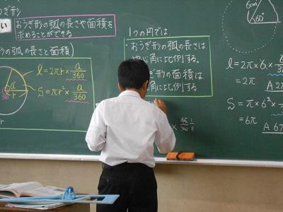 【校内授業研究】 1時間目に1年3組で数学科「おうぎ形」の公開授業が行われました。円の弧の長さや面積の求め方を確認し、扇の形の弧の長さや面積の求め方に発展していました。生徒は全員集中して取り組んでいました。