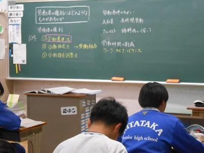 【授業研究】 6時間目に3年1組で社会「労働者の権利」についての公開授業がありました。労働基準法や労働組合法など働く人のための権利をしっかり学んでいました。また、アルバイトと正社員の違いについても、保証や金銭などの比較も学んでいました。