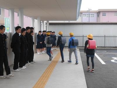 【あいさつ運動】 東小学校の門の前で、本校評議委員(各学級会長)があいさつ運動を実施しました。バスから下車した小学生に手を振りながらあいさつしていました。微笑ましい光景でした。