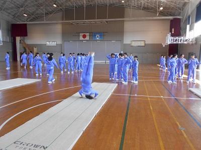 【授業の様子】 1年生が保健体育の授業で「マット運動」を行っていました。次の時間に発表会を行うため、各自が連続技を練習していました。