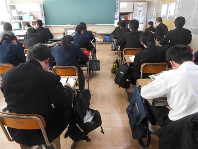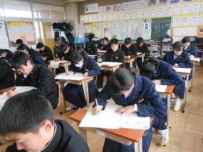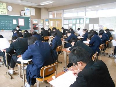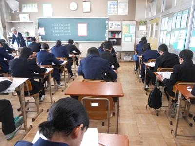 さて、今日で3年生の授業は終了となります。3年生は各教科の学習内容が終了し、明日の受検に向けて問題に必死に取り組んでいました。中には面接での回答について練習している生徒もいました。明日は自信を持って入試に臨んでほしいです。
