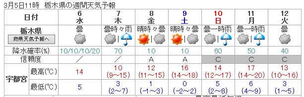 【週間天気予報】 週間天気予報では、明日から天気が崩れ卒業式前日は雨が降る予報です。現在、卒業式に向けて準備を進めていますが、雨が降らないことを祈ります。