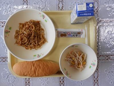 【給食メニュー】 焼きそば、ごぼうサラダ、コッペパンです。ごぼうサラダはよくかんでいただきました。