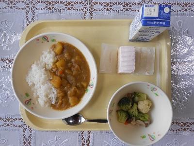 【給食メニュー】 チキンカレー、ブロッコリーとしめじサラダ、ケーキです。今日は卒業祝いメニューとしてケーキがつきました。3年生最後の給食を堪能してください。