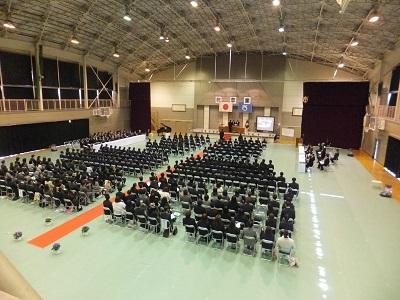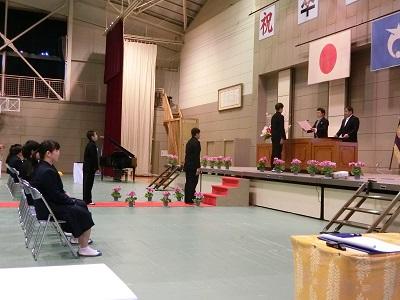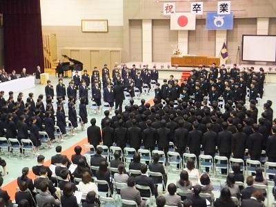 【卒業式】 10:00から開始された「卒業式」は、厳粛の中、感動ある内容で無事終了いたしました。多くの御来賓、保護者等の参列の中、3年生は立派な態度で学び舎を去って行きました。この3年間で大きく成長した姿を保護者の方々が実感したことでしょう。これから、情報通信技術の急速な発展、社会・経済のグローバル化、超少子高齢化の進展により生活の基盤が大きく変化する中で、本校で学んだ経験と友情を忘れず、自分の夢に向かって精進することを期待しています。