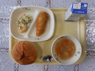 【給食メニュー】 丸パン、コールスローサラダ、白身魚フライ、ABCマカロニスープです。