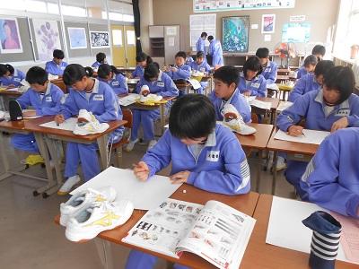 【授業の様子】 1年2組の美術の授業です。体育館シューズのデッサンを行っていました。特徴を捉え、真剣に鉛筆を動かしていまいた。