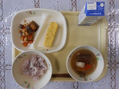【給食メニュー】 黒柴米入りご飯、彩り野菜の卵焼き、五目煮豆、芋がら入りの味噌汁です。