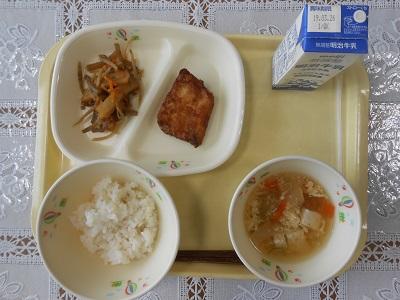 【給食メニュー】 モロ竜田揚げ、五目きんぴら、かき卵汁、麦ご飯です。