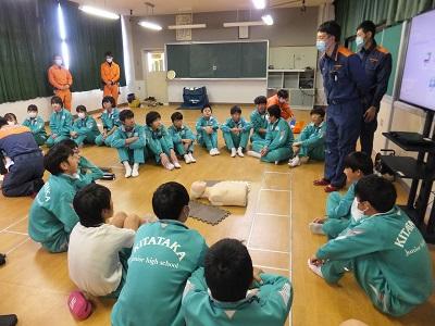 【救命講習】 2・3時間目に2年1組が保健体育の授業で「心肺蘇生法」を学びました。高根沢消防署より3名の消防署員の方を講師に招き、状況確認の方法や蘇生の方法をきめ細かに御指導いただきました。本校にも「AED」が職員室前と体育館に設置されています。安全教育の一環としてしっかり取り組んでいました。