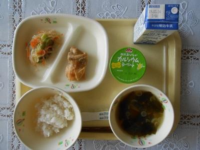 【給食メニュー】 チキンソテー、春雨サラダ、豆腐とわかめの味噌汁、ヨーグルトです。