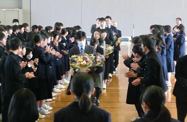 式の前に2年前に那須岳の雪崩によりお亡くなりになった7名の高校生と1名の教員の御冥福をお祈りし、1分間の黙祷を行いました。その後、異動される先生方から学校の思い出や生徒への期待のことばをいただきました。春休みにもかかわらず、多くの生徒が体育館に集合し、異動される先生方のお話を涙ながらに聞いていました。異動される先生方の今後の御健康と御活躍を御祈念申し上げます。