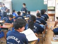 給食の時間、栄養教諭が1年1組の生徒に「食に関する指導」を行いました。朝食の大切さを教えてもらいました。「早寝・早起き・朝ご飯」生活の基本ですね。
