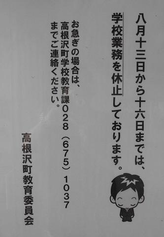 昨日はお墓参りをし、盆の準備をした方も多かったのではないでしょうか。さて、8/13~16は「業務休止」で学校には教職員はおりません。生徒の命にかかわるような緊急の場合は町教育委員会に御連絡ください。