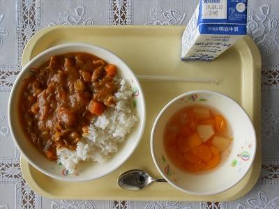 【給食メニュー】 夏野菜カレー、フルーツポンチです。かぼちゃ、トマト、なす等、夏にできる野菜がたくさん入ってとてもまろやかでした。
