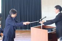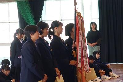 【生徒集会】 生徒集会では過日、県新人大会で優勝したソフトボール大会の賞状の伝達と明日開催される「地区中学校駅伝競走大会」の選手壮行会を行いました。