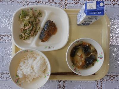 【給食メニュー】さんまみぞれ煮、キャベツとツナのサラダ、豆腐とわかめの味噌汁です。