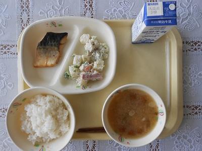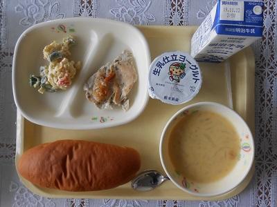 【給食メニュー】鶏肉のハーブ焼き、さつまいものサラダ、カボチャのスープ、ヨーグルトです。今週は「地産地消週間」です。県産・町産のものがたくさん使われます。