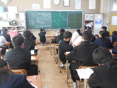 【授業参観】1年1組「数学」比例・反比例を学ぶに当たり、三角形の1頂角が動くことにより、三角形の面積がどのように変化するかを学びました。友達と相談しながら解答を導いていましたが難しい内容でした。