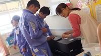 1年2組「家庭」、栄養教諭の方の御指導をいただき、栄養のバランスを考えた献立を考えています。