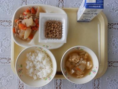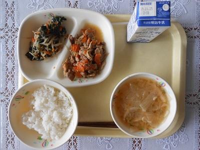 【給食メニュー】厚焼き卵、切り干し大根の煮物、じゃがいもとわかめの味噌汁です。味噌汁が身体を温めてくれました。卵の味は濃厚です。