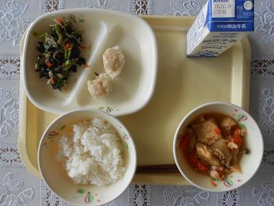 【給食メニュー】麻婆豆腐、てんぐにらまんじゅう、わかめともやしナルムです。麻婆豆腐には豆腐がたくさん入っていました。
