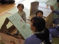 【保育園訪問】家庭科の授業で「保育」を学びます。2年3組が「にじいろ保育園」に訪問し、自分たちで作った遊び道具で園児と一緒に楽しい時間を過ごしました。