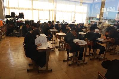 【高校説明会】雨が降る寒い中、体育館で「県立高等学校等説明会」を行いました。日程や願書等の提出日など、細かな説明をさせていただきました。今月末から私立高校のインターネット出願、更には特色選抜入試校内受付等、様々な進路事務が行われます。夢を実現させるために、今はしっかり学習することですね。