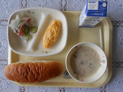 【給食メニュー】ハチミツパン、オムレツ、大根サラダ、たっぷりきのこの豆乳スープです。この「たっぷりきのこのスープ」は、本校3年生が簡単レシピで考えてくれたメニューです。