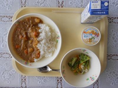 【給食メニュー】ポークカレー、花野菜サラダ、にっこりなしゼリーです。カレーは辛さ控えめで、とてもまろやかな味でした。