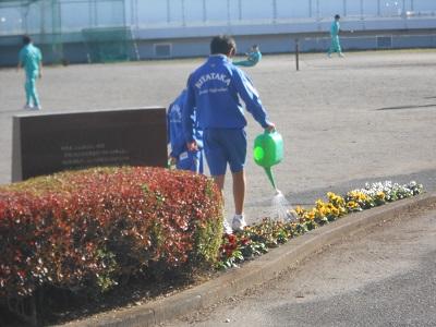 【昼休みの様子】環境緑化委員の生徒が花壇の花に水をあげています。この寒さに耐え、いつまでもきれいな花を咲かせてほしいです。