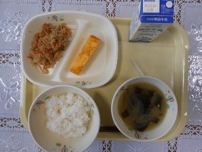 【給食メニュー】厚焼き卵、切り干し大根の煮物、じゃがいもとわかめの味噌汁です。味噌汁が身体を温めてくれました。卵の味は濃厚です。