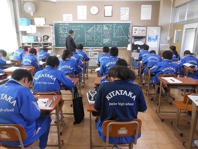 【授業参観】1年1組「数学」比例・反比例を学ぶに当たり、三角形の1頂角が動くことにより、三角形の面積がどのように変化するかを学びました。友達と相談しながら解答を導いていましたが難しい内容でした。
