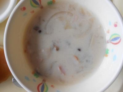 【給食メニュー】ハチミツパン、オムレツ、大根サラダ、たっぷりきのこの豆乳スープです。この「たっぷりきのこのスープ」は、本校3年生が簡単レシピで考えてくれたメニューです。