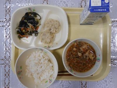 【給食メニュー】麻婆豆腐、てんぐにらまんじゅう、わかめともやしナルムです。麻婆豆腐には豆腐がたくさん入っていました。