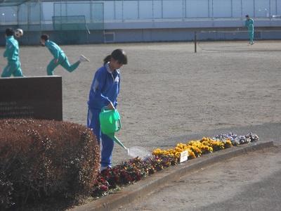 【昼休み】環境緑化委員が当番で花壇に水をあげています。寒さに負けず元気に花を咲かせているのもお水(栄養)があるからですね。係の皆さんありがとうございます。