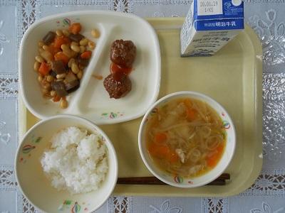 【給食メニュー】野菜肉団子、五目煮豆、どさんこ汁です。