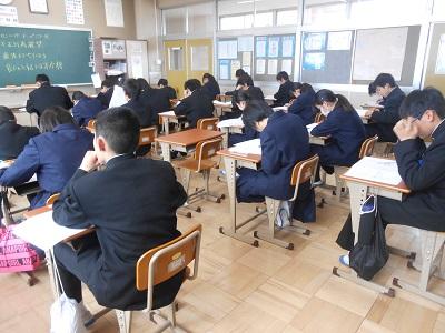 さて、今日から「期末テスト」が始まり、1年間のまとめのテストとして9教科で行われます。インフルエンザ罹患者もなく、一生懸命問題を解いていました。明日もあるので、今夜もしっかり学習に取り組んでほしいです。