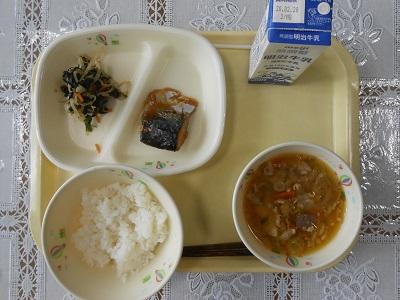 【給食メニュー】サバ味噌煮、おひたし、豚汁です。豚汁にはたくさんの野菜が入っていました。