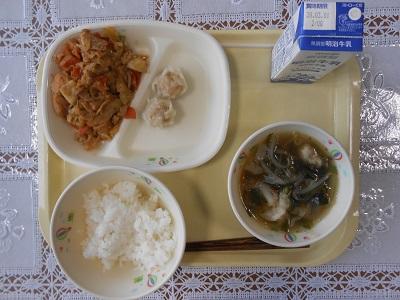 【給食メニュー】えび焼売、生揚げとキャベツの味噌炒め、ワンタンスープです。