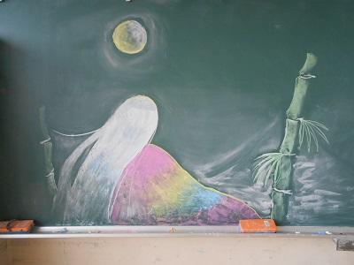 3年教室の黒板にチョークで描かれていました。卒業する心境がかぐや姫が月に帰る心境と同じと例えていたのでしょうね。