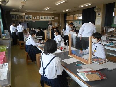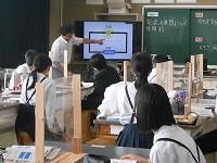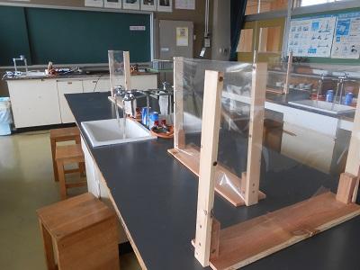 ※理科室は構造上、向かい合っての座席になっています。理科の教員が工夫し、コロナ対策パーテーションを手作りで設置しました。活動に応じて使用するそうです。