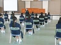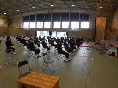 1時間目は体育館で学校経営方針や今後の行事、進路等についての説明がありました。ソーシャルディスタンスに配慮しての実施です。