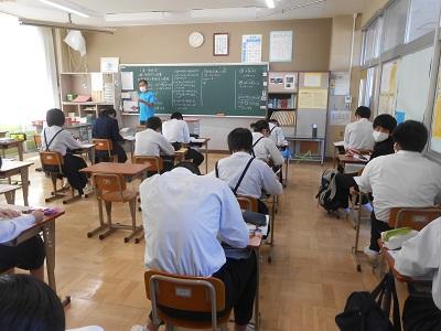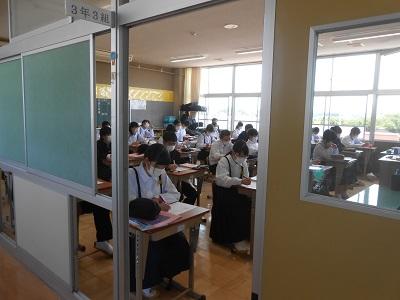青空の中、3年生は時間を守り元気に登校してくれました。授業も順調に進み、3つの密・新しい生活様式にも慣れ、感染症対策に配慮しながら学校生活を送っています。