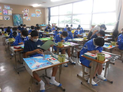 3年2組「美術」空想画での色彩について、水彩絵の具を混ぜながら情景を表していました。