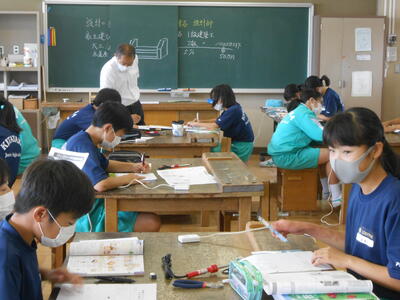 1年3組「技術」木材加工で実際に板を切ってのり付けを学んでいました。