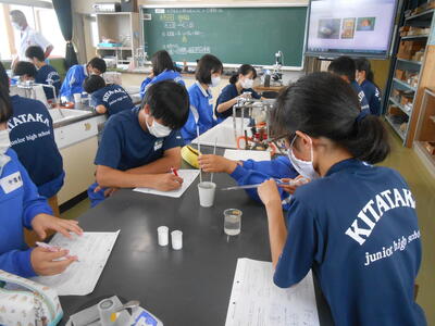 3年3組「理科」水溶液での化学変化等の単元について、まとめていました。