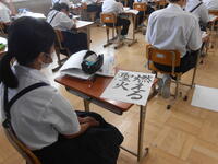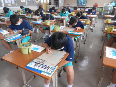1年2組「美術」スケッチブックの表紙に、自分の名前をレタリングし染色していました。誰もが集中して静かに取り組んでいました。