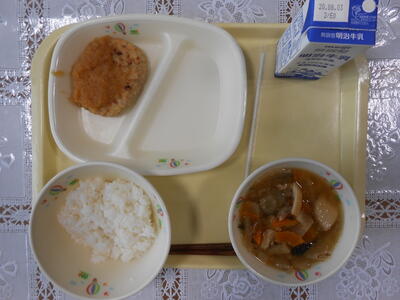 【給食メニュー】豆腐ハンバーグおろしソースがけ、根菜のごま汁です。ごま汁には具がたくさん入っていて、何食材か数えてみましたが無理でした。