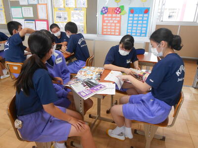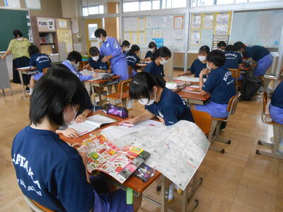 【修学旅行事前学習】修学旅行まで約2か月となりました。各グループでは2日目の班別行動について資料や地図を参考に決めていました。特に昼食では予約が必要なお店なども調べていました。現在、国土交通省観光庁の「Go To トラベルキャンペーン」の対象になるとのことです。旅行業者に一時、全額支払いますが、半額相当が対象になり、約7割が代金割引、約3割が地域共通のクーポンで還元されるようです。とにかく生徒が楽しみにしている「修学旅行」が予定どおり実施できることを願うばかりです。